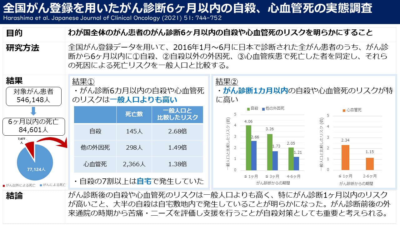 Harashima S, Fujimori M, Akechi T, Matsuda T, Saika K, Hasegawa T, Inoue K, Yoshiuchi K, Miyashiro I, Uchitomi Y, Matsuoka YJ. Suicide, other externally caused injuries and cardiovascular death following a cancer diagnosis: study protocol for a nationwide population-based study in Japan (J-SUPPORT 1902). BMJ Open 2019; 9(7): e030681.