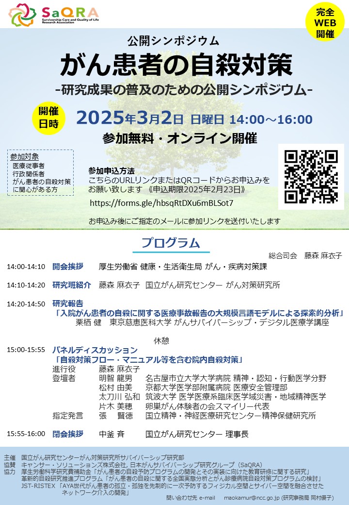 参加対象:医療従事者・行政関係者・がん患者の自殺対策に関心がある方